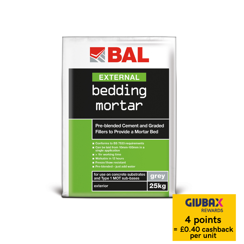 BAL Bedding Mortar is a special cement with graded fillers for producing a high performance mortar bed for external use, allowing external pavers and tiles to be fixed to the requirements of BS 7533-4. Bed depth can be achieved from 10mm up to 100mm thickness (minimum 25mm on MOT Type 1).