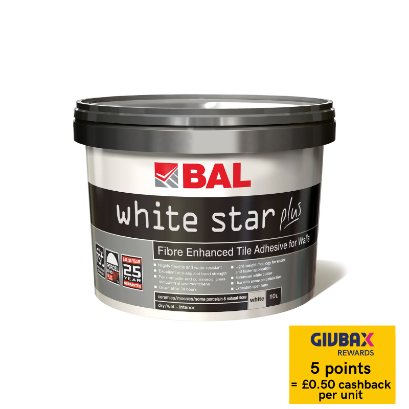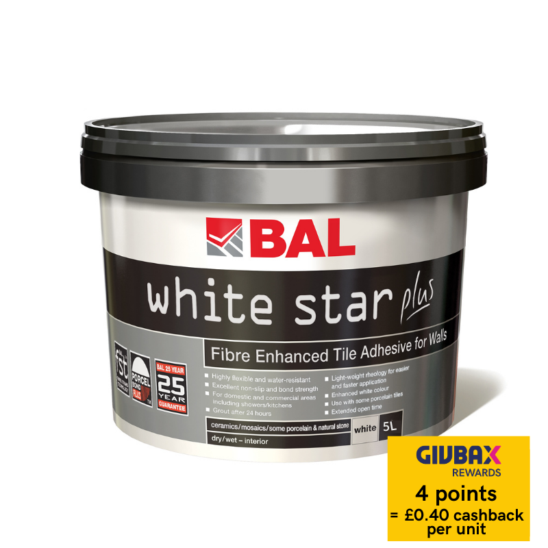 With it’s lightweight rheology for easier and faster application, contractors can be sure that with BAL White Star Plus, their tiling project will be completed on time and within budget. BAL White Star Plus exceeds industry standards and offers outstanding properties for domestic and commercial projects including communal showers and commercial kitchens. BAL White Star Plus comes in an enhanced white colour and three handy sizes 10l, 5l and 2.5l to suit your requirements.