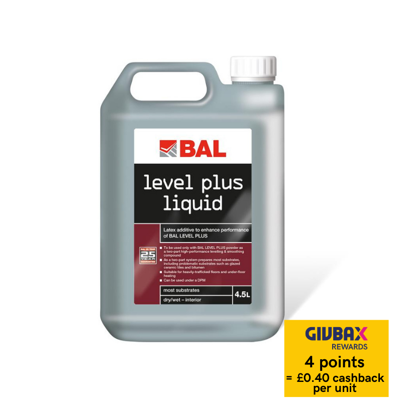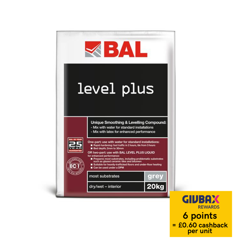 BAL Level Plus is a unique 1-part or 2-part rapid-setting smoothing and levelling compound. Mix with water for use in standard installations, or mix with BAL Level Plus Liquid latex as a high-performance 2-part, moisture tolerant floor leveller for superior enhanced performance. Use from 2-12mm as a 1-part over concrete, sand:cement screed, anhydrite and old tile adhesive residue, use from 2-10mm as a 2-part with latex over bitumen, flooring grade asphalt, underfloor heating, direct onto glazed tiles, existing vinyl (not LVT) and under DPMs.