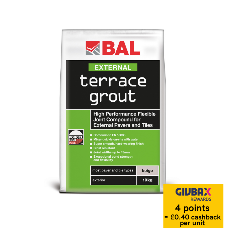 Mixing quickly on-site with water, BAL Terrace Grout provides a smooth finish on external tiled or paved patios, terraces and paths. Easy to spread, with a pot life of 45 minutes, BAL Terrace Grout is the fixers choice for jointing external pavers, tiles and natural stone. Available in 10kg bags, coverage is approximately 0.5kg/m2 at 5mm joint widths. 24 hours cure time.