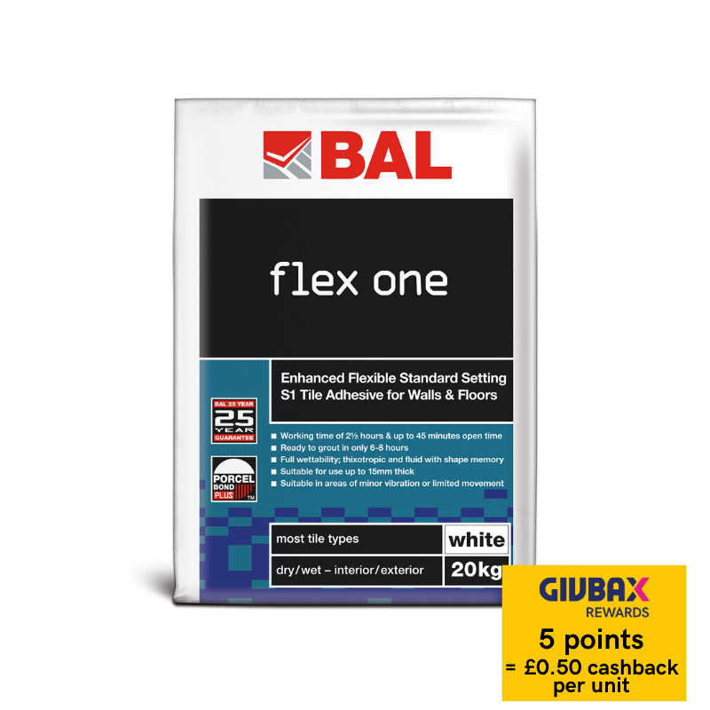 BAL Flex One truly revolutionises the standard-set category with a long open and working time, excellent non-slip properties and may be grouted in as little as six hours! With an extended pot life of 2 1/2 hours and open time of 45 minutes, BAL Flex One standard set flexible tile adhesive lets you set your own pace! BAL Flex One is particularly recommended for large format tiles, areas of total immersion, heated screeds and areas subject to movement and vibration.