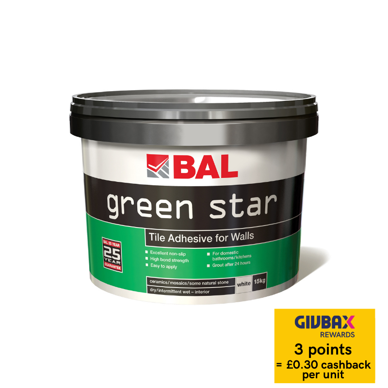 BAL Green Star is a ready mixed and easy to apply wall tile adhesive. Suitable for fixing ceramics, mosiacs and some natural stone in dry or wet interior environments, it can also be used for domestic areas including showers, kitchens and bathrooms. BAL Green Star offers extended open time of 30 mins and can be grouted after 24 hours.