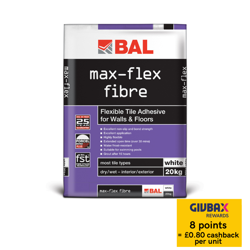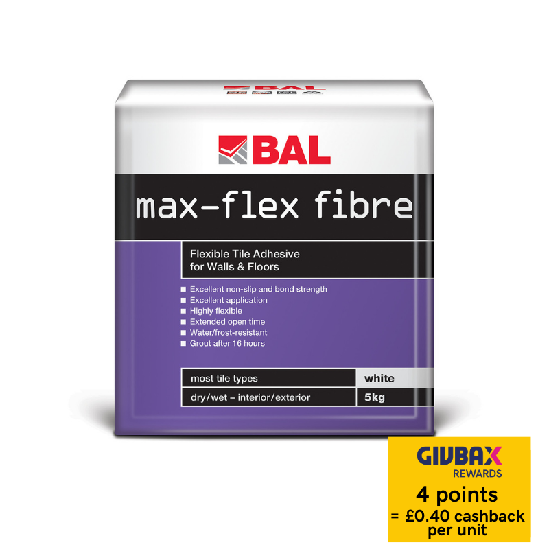 Standard setting and highly flexible tile adhesive, BAL Max-Flex Fibre have been developed with our Fibre Strand Technology for improved flexibility and strength. With and extended open time of more than 40 minutes and a pot life of 5 hours, BAL Max-Flex Fibre is suitable for use fixing most tile types (including some natural stone), BAL Max-Flex Fibre is recommended for large format wall tiles, areas of total immersion, and heated screeds. Also suitable for installations subject to limited movement and vibration and for tiling on existing glazed ceramic tiles. Recommended for fixing mosaics.